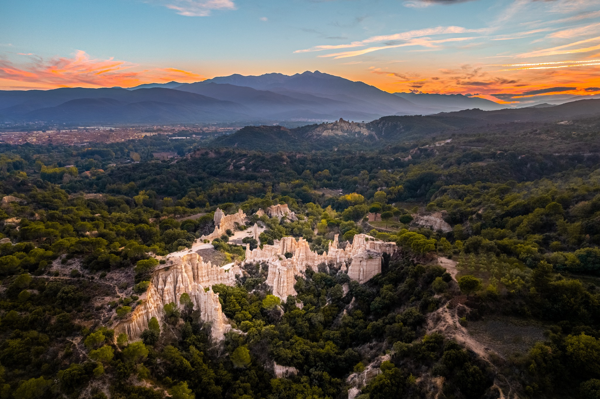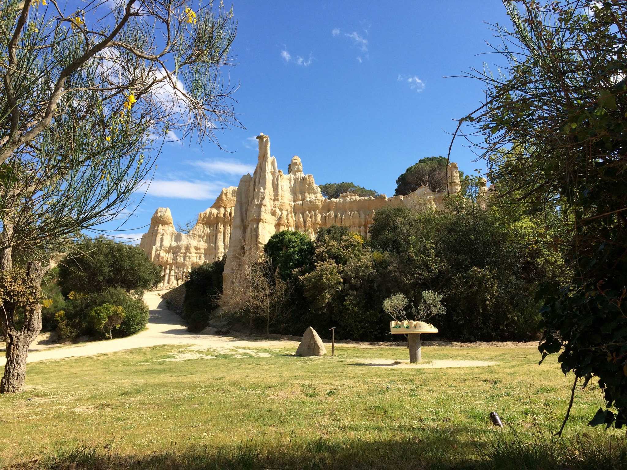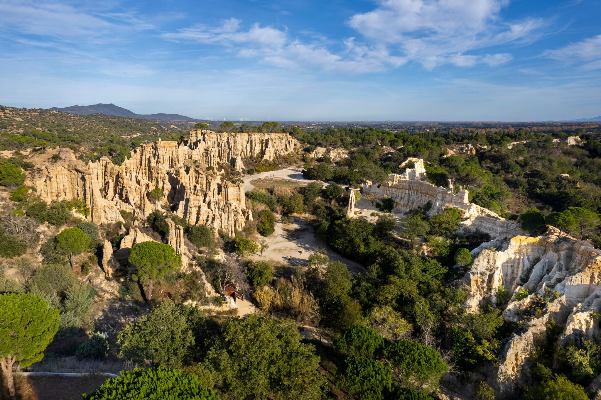 Ces falaises ont été sculptées par le vent, mais d'autres facteurs sont entrés en jeu pour parvenir à ce résultat : l'érosion, l'eau coulant du plateau au-dessus vers la Têt, le fleuve côtier tout proche, et le soleil, qui a brûlé la terre argileuse mêlée aux roches friables et qui donne les lignes de couleurs horizontales que l'on voit parfois.