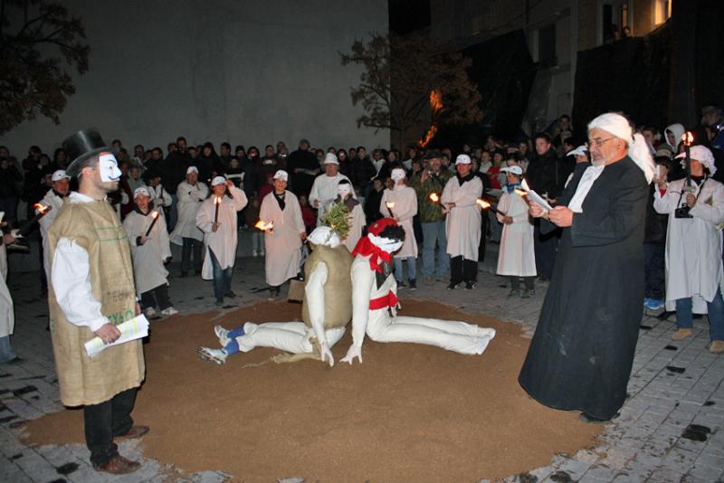 Dès le matin, des comportes sont déposées dans le centre du village et remplies d'une lie de vin gluante, à l'odeur répugnante.
