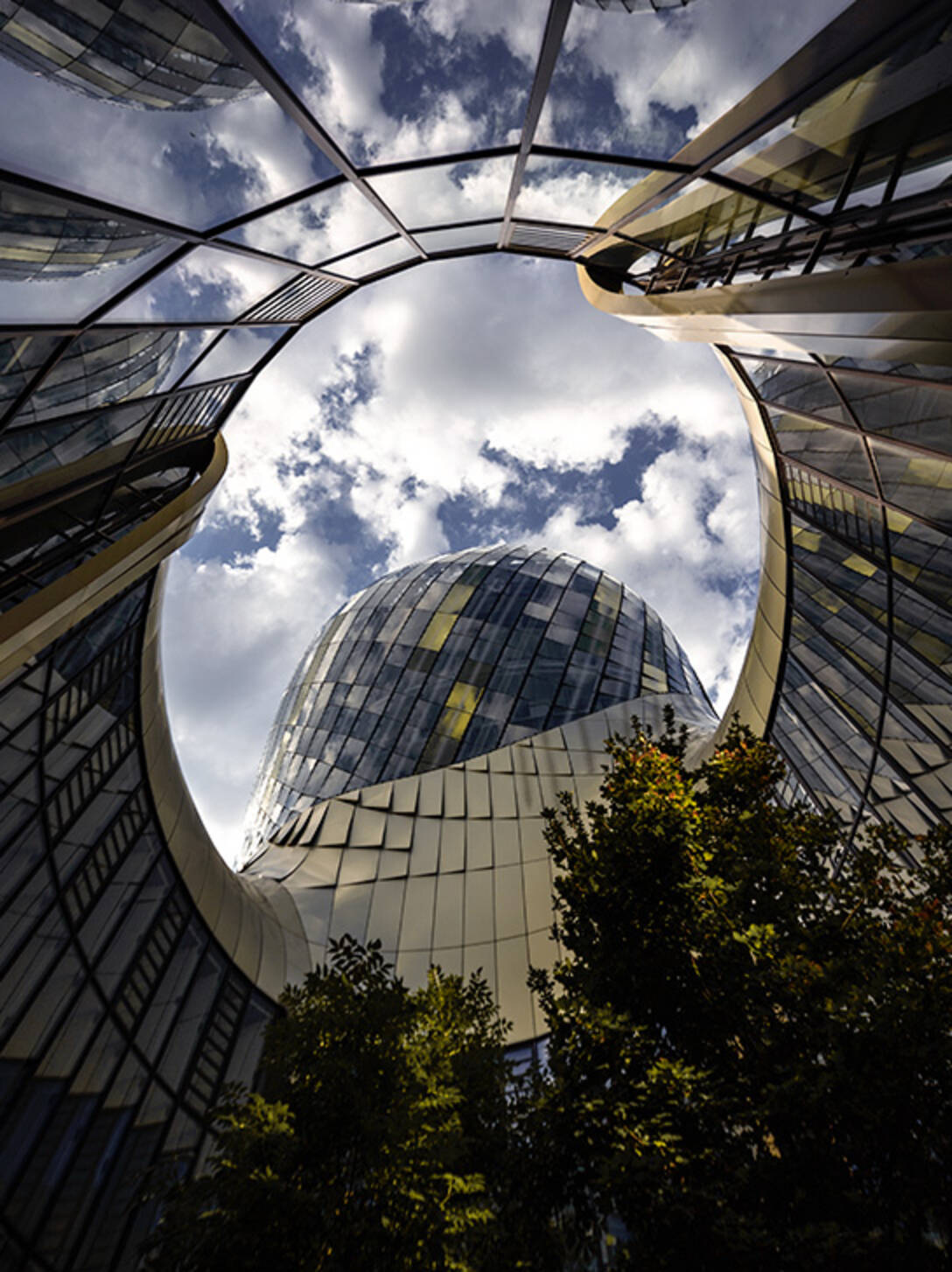 L’édifice de 9 000 m3 de béton repose sur 300 pieux en béton descendant jusqu’à 30 mètres de profondeur. La structure est recouverte de 918 panneaux de verre de trois couleurs : vert clair, gris (teinté dans la masse) et doré, et de 2 300 panneaux d’aluminium de tailles différentes. Sa façade est constituée de panneaux de verre sérigraphiés et de panneaux d’aluminium laqués irisés perforés. La tour culmine à 55 mètres.