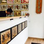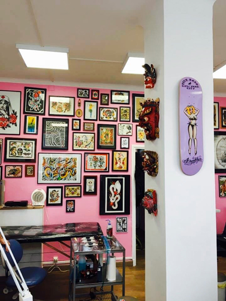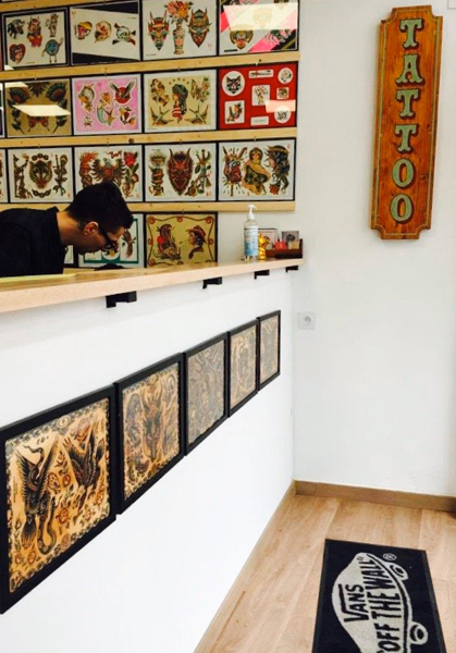 Au sein du salon au style et à l’ambiance « cool », de nombreuses représentations de tatouages, de dessins, de planches de flash agrémentent les murs.