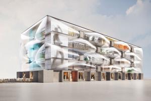 Au cœur du nouveau centre urbain de Montpellier, Philippe Starck a créé, pour le groupe Roxim, « Le Nuage », premier bâtiment privé gonflable en Europe.
