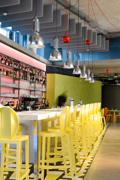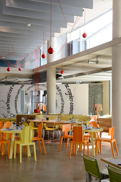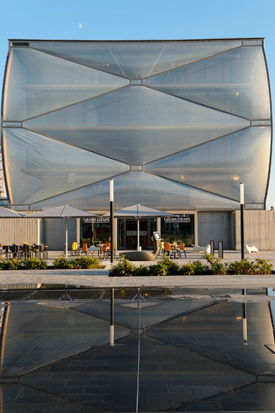 Cette bulle est gonflée d’air pulsé à 700 bars, autour de la structure en dur. Elle est fabriquée dans un matériau plastique sérigraphié ultra fin, un polymère dit ETFE, aux propriétés thermiques remarquables. Une alternative au verre qui n’ôte rien aux jeux de transparence, laisse rentrer la lumière naturelle, et fait naître des interactions visuelles permanentes entre l’intérieur et l’extérieur ».