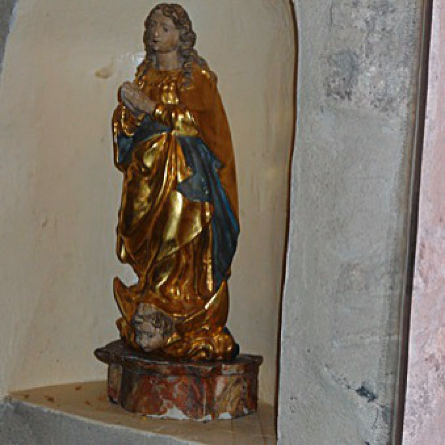 Cette statue en bois polychrome doré du XVIIe siècle représente en effet la Vierge, le ventre rebondi.